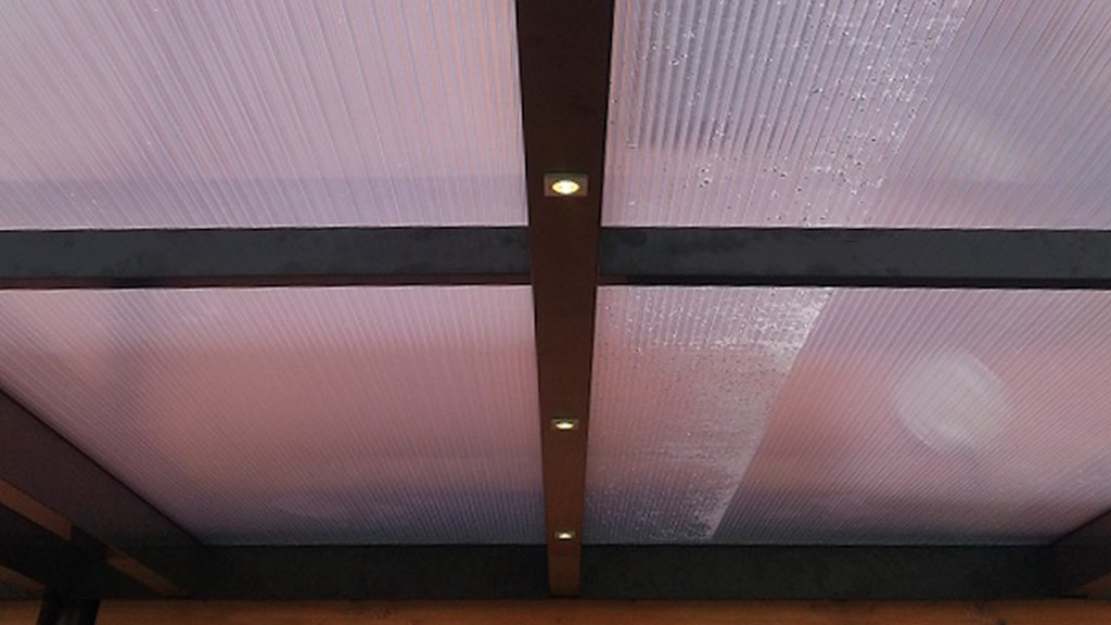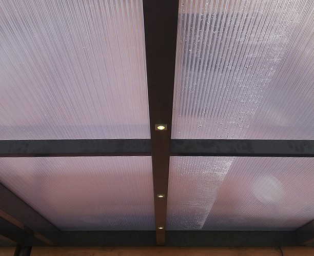 Opal og brun kanal polykarbonatbelegg på NORDIC hagestue. Foto Uteluksus