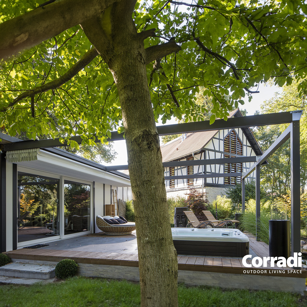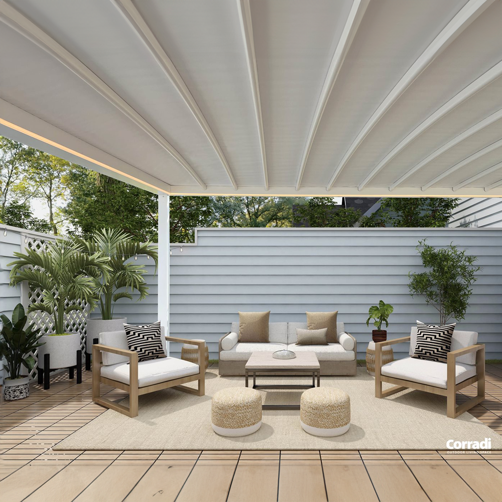 Et karakteristisk kjennetegn ved Pergola SANDEFJORD er det flate, uttrekkbare taket laget av slitesterkt polyesterstoff. Dette stoffet fungerer som et effektivt dekke mot både sol og regn, og gir maksimal beskyttelse i ulike værforhold. Det bevegelige taket er tilgjengelig i flere farger, slik at du kan tilpasse pergolaens estetikk til omgivelsene. Taket er laget av et materiale som ikke slipper gjennom lys og gir utmerket solbeskyttelse. Det er fullstendig vanntett og svært motstandsdyktig mot UV-stråler, noe som sikrer langvarig holdbarhet. Åpning og lukking av taket skjer med motordrift og kan fjernstyres for optimal komfort