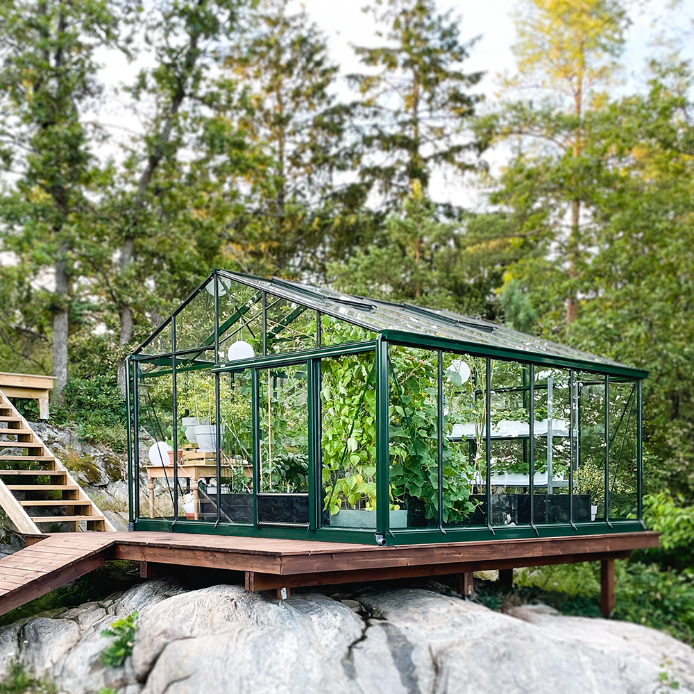 Drivhuset Vår har mange muligheter og kan brukes til så mye mer enn bare dyrking av planter. Bruk våren og sommeren til å vokse planter, hvile om høsten, dekorere juletreet om vinteren eller som oppbevaring til utemøbler og sykler! Vi anbefaler å bestille en dobbel dør. Plasser dem på langveggen eller gavlen.