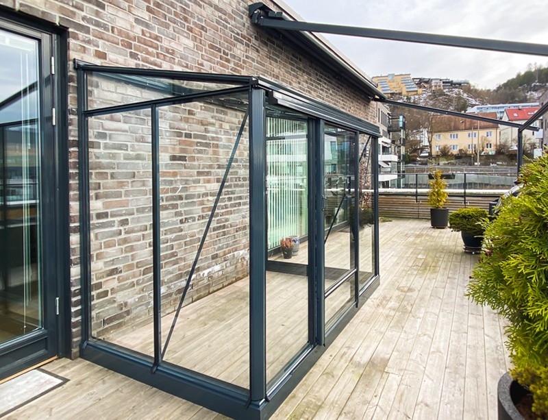 Klar og brun laminert glass på veggdrivhus – AMATØR. Foto Uteluksus